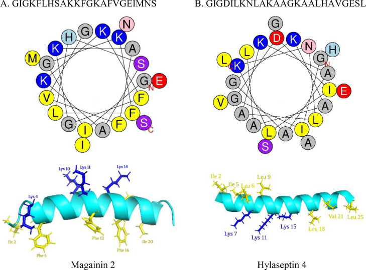Cationic AMPs are obtained from various sources, and amphibians are one of the major sources of AMPs. Many amphibian, cationic AMPs remain unstructured in an aqueous solvent. However, in the presence of a lipid membrane, they are converted into a well-defined secondary structure (e.g., alpha-helix or beta-sheet), which plays an important role in antibacterial activity (Takahashi et al., 2010; Hasan et al., 2022). These amphibian, cationic AMPs having alpha-helical structures can be called as CαAMPs. In the alpha-helical structure, a rod-like structure is formed by a tight right-handed twist in the amino acid chain. This shape is caused by hydrogen bonding between the hydrogen in an amino group and the oxygen in a carboxyl group. Most alpha helices are amphiphilic, which means they contain both hydrophilic and hydrophobic regions. Usually, the hydrophilic residues are located opposite to the hydrophobic residues. The secondary structure and helical wheel projection of two well-studied CαAMPs are shown in Fig. 1.