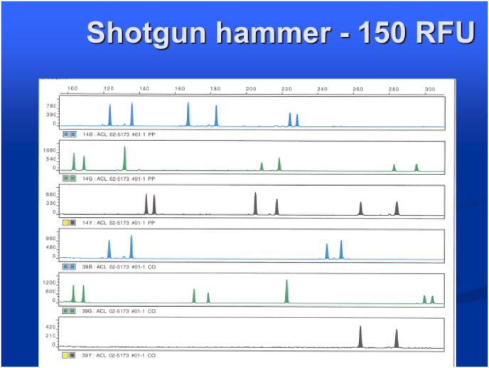 Analysis of the swabs taken from the shotgun are found in Fig. 2, Fig. 3, Fig. 4 for the forearm, butt stock grip, and hammer respectively. The DNA profile found on the forearm of the shotgun (Fig. 2) was a single source female profile which matched the deceased.