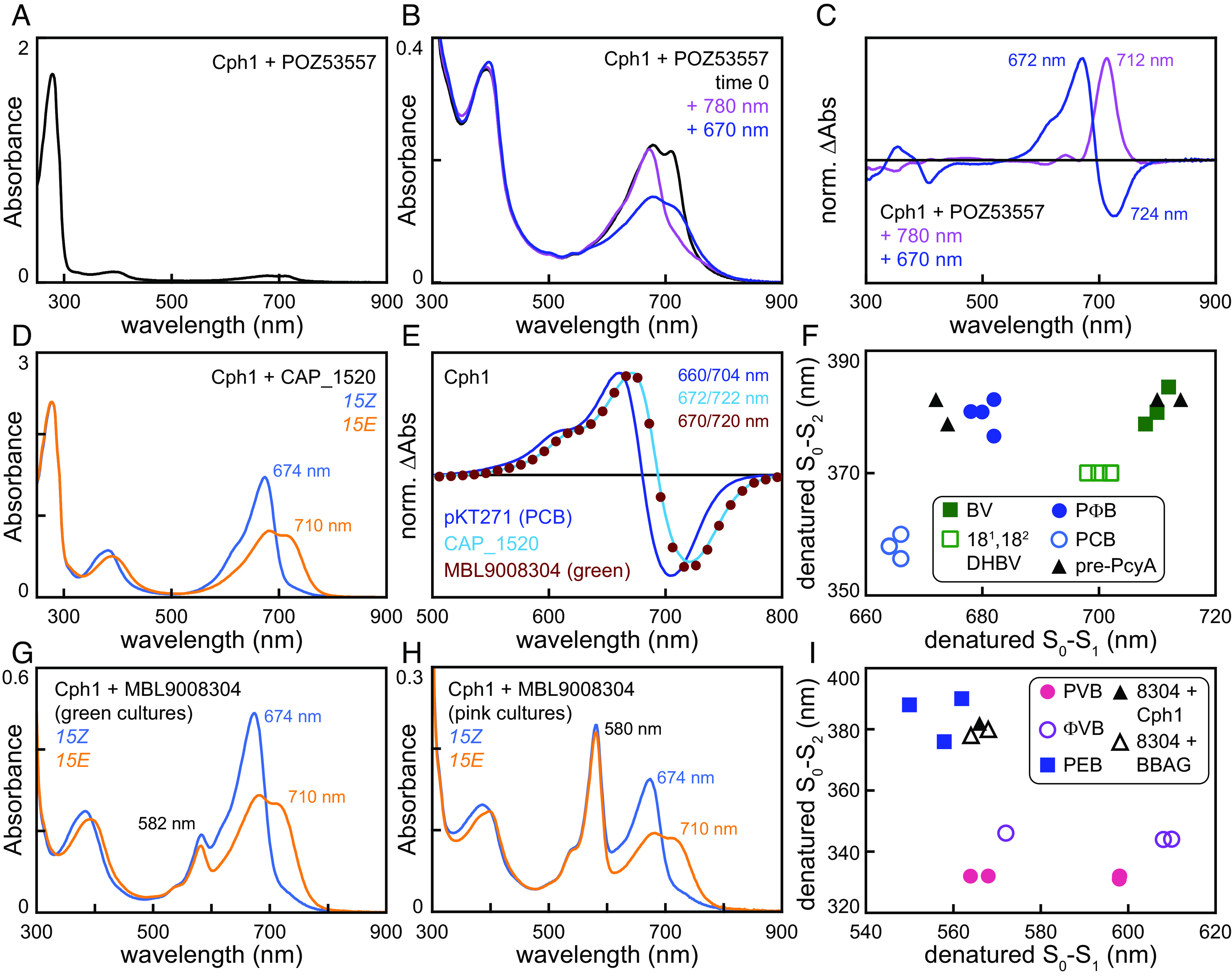 - 44.Rockwell N. C., Martin S. S., Gulevich A. G., Lagarias J. C., Phycoviolobilin formation and spectral tuning in the DXCF cyanobacteriochrome subfamily. Biochemistry 51, 1449–1463 (2012). [DOI] [PubMed] [Google Scholar]