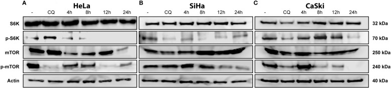 TT-induced suppression of the mTOR pathway. (A) HeLa, (B) SiHa, and (C) CaSki CC cell lines. All cells were treated with TT at 4, 8, 12, and 24 (h) Chloroquine (positive control). The blots are a representative figure of at least three independent experiments.