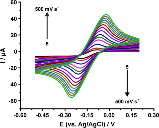 To calculate the electrochemically active area of the electrodes via cyclic voltammetry, by using, depending on the for each recorded CV, the appropriate in each case Randles-Ševčík equation, CVs in 1 mM RuHex in KCl, 1 mM ferricyanide in 0.1 M KCl, pH 3 and 1 mM ferricyanide in 0.1 M PBS, pH 7 at different scan rates (5, 10, 25, 50, 75, 100, 150, 200, 250, 300, 350, 400, 450, and 500 mV s−1) were recorded. Although there are many examples in literature showing that a CV measurement at a single scan rate can yield useful information, we suggest running a series of CV measurements at different scan rates. Then, can be averaged from the calculated values in each scan rate or can be found graphically from the appropriate plot. As an example, the CVs obtained with a graphite SPE in 0.1 M KCl containing 1 mM RuHex in 0.1 M KCl at different scan rates are depicted in Fig. 4, while to compare the CV responses at the three examined measuring solutions, the CVs obtained in each case at the same scan rate value (50 mV s−1) are presented in Fig. 5.