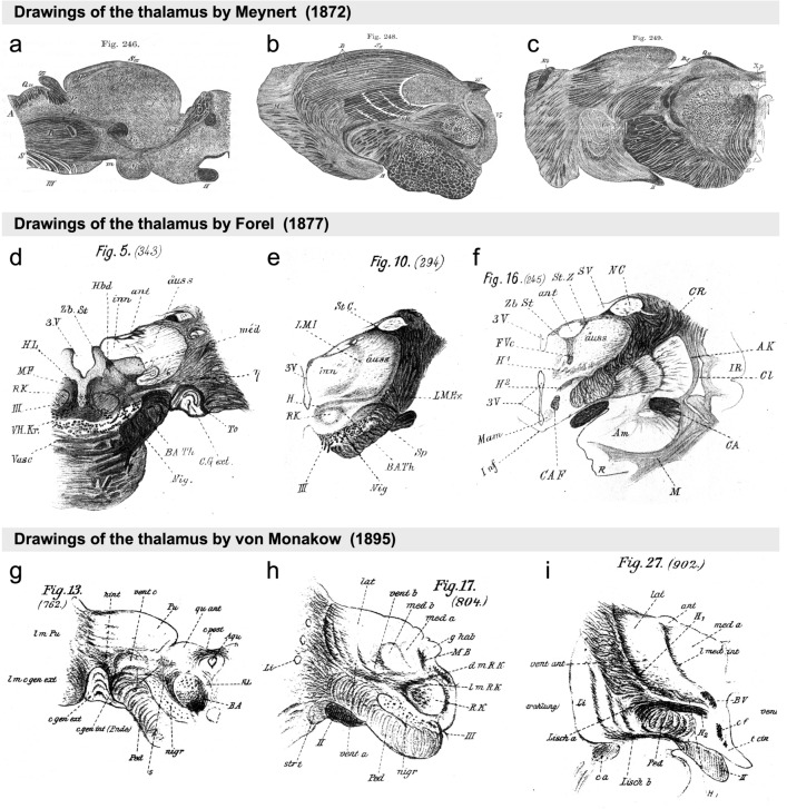 Drawings of the nuclear parcellation of the human thalamus by German authors in the second half of the nineteenth century. a–c Drawings made after sagittal (a) and coronal (b, c) transparent sections by Meynert (1872); the stain used shows poor differentiation of thalamic nuclei. d–f Drawings made from transparent coronal sections by Forel (1877). g–i Drawings made from sections stained with carmine red by von Monakow (1895). Images from Meynert (1872) are reproduced from a copy of the original publication in the private collection of Dr. García-Cabezas. Images from Forel (1877) and von Monakow (1895) are reproduced from copies of the Archiv für Psychiatrie und Nervenkrankheiten journal in the Library of Cajal Institute (Spanish Research Council-CSIC-Library Network), Madrid, Spain