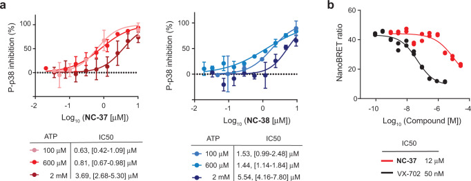 a Inhibition curves of p38α autophosphorylation by different concentrations of compounds NC-37 and NC-38 (0.035 to 10 μM) at the indicated ATP concentrations. Results are shown as mean ± SD (n = 3 experiments). Data were fitted using a nonlinear regression fit model (Graphpad Prism) to determine the IC50s, with 95% confidence intervals indicated in brackets. b HEK293T cells expressing NanoLuc-fused p38α were incubated with a cell-permeable energy transfer probe, which generates a BRET signal upon binding to the ATP site of p38α. Cells were incubated with different concentrations of compound NC-37 or the ATP-competitive inhibitor VX-702 as a control, and the NanoBRET ratio was measured to calculate the IC50. Results are shown for two technical repeats from a representative experiment. In total two biologically independent experiments were performed and gave similar results. Source data are provided as a Source data file.