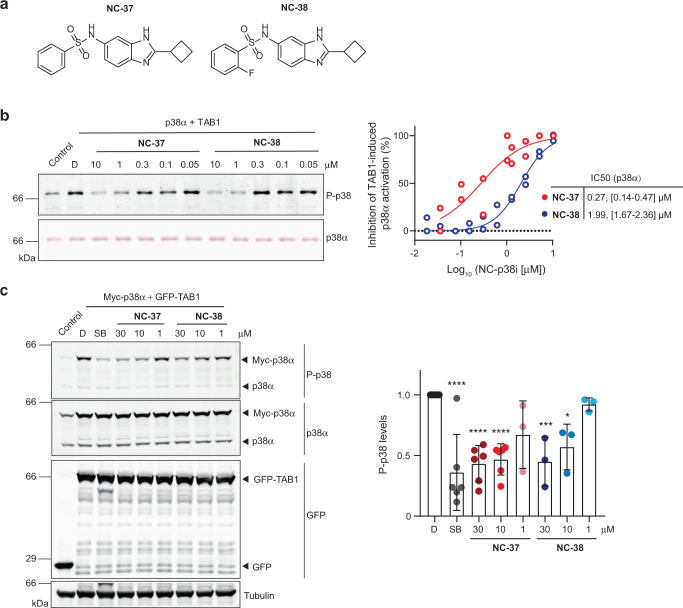 a Structure of compounds NC-37 and NC-38. b Purified GST-p38α protein (1.5 μM, 2 μg in 20 μl) was incubated in autophosphorylation buffer with TAB1386–414 peptide (15 μM) and ATP (600 μM) in the presence of DMSO (D) or the compounds NC-37 and NC-38 at the indicated concentrations. Control, GST-p38α and ATP without TAB1. After 2 h at 37 °C, samples were analyzed by Ponceau staining and immunoblotting with antibodies anti-phospho-p38 (T180/Y182). Values were normalized to the phosphorylated p38α levels in the DMSO sample. Data were fitted using a nonlinear regression fit model (Graphpad Prism) to determine the IC50s, with 95% confidence intervals indicated in brackets. n = 2 experiments. c HEK293T cells were co-transfected with GFP-TAB1 and myc-p38α and then were treated with SB203580 (SB, 10 μM), DMSO (D) or compounds NC-37 and NC-38 at the indicated concentrations for 6 h. Control, cells co-transfected with GFP and myc-p38α. The histogram shows the quantification of p38α phosphorylation levels normalized to the DMSO-treated cells. Data are shown as the mean ± SD (D, n = 8; SB 30 μM and NC-37 10 μM, n = 6; NC-37 1 μM and all concentrations of NC-38, n = 3). One-way ANOVA test was used to compare the P-p38 levels in samples treated with the different inhibitors versus D. *p < 0.05, ***p < 0.001, and ****p < 0.0001. Source data are provided as a Source data file.