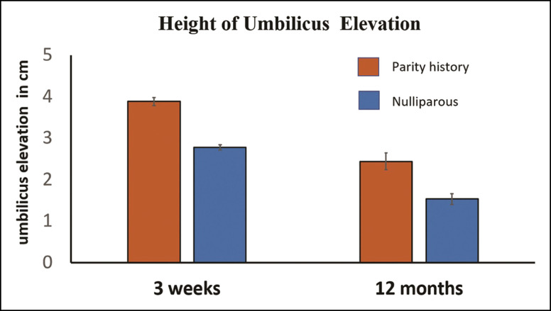 Significant difference exists between the parity groups and the nulliparous group when umbilicus elevation levels are compared. Standard errors are represented by vertical bars on the columns. At 3 weeks postsurgery, the mean umbilicus elevation was 3.886 cm for the parity group, and 2.778 for the nulliparous group. At 12 months postsurgery, the numbers were 2.444 and 1.533 cm, respectively (P < 0.001).