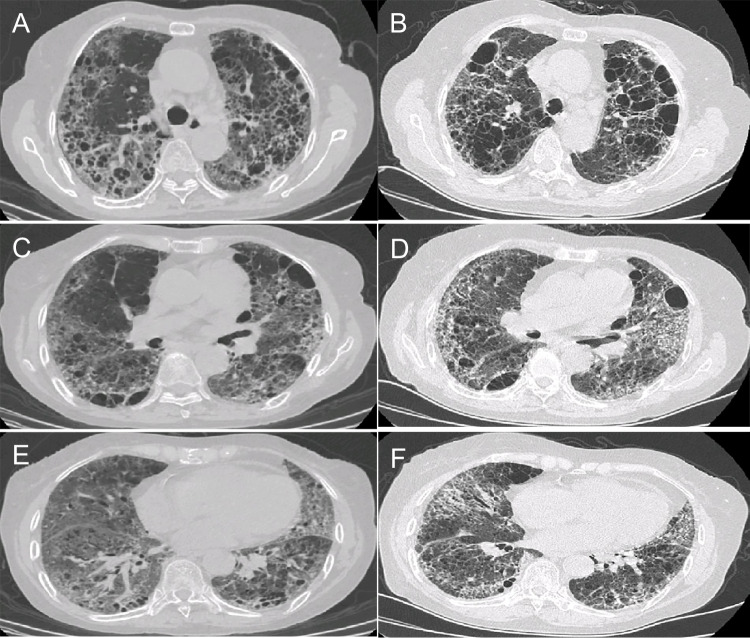 PPF was defined according to the 2022 Official Clinical Practice Guideline as a combination of at least two of the following three domains within 12 months: worsening respiratory symptoms, physiological evidence of disease progression (absolute decline in FVC > 5% predicted and or DLCO (corrected for Hb) > 10% predicted), or radiological evidence of disease progression (increased extent of fibrotic features) [9].