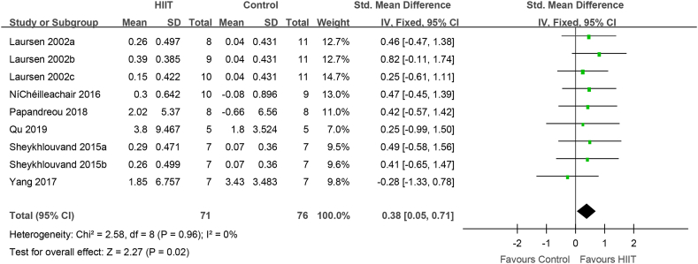 VO2max (VO2peak) after HIIT was evaluated in 96 elite male athletes from 5 studies. Compared to that with conventional training, VO2max(VO2peak) was significantly increased after HIIT in male athletes (0.41 [0.06, 0.76], P = 0.02) (Fig. 4). There was no heterogeneity in the included studies (I2 = 0%, P = 0.89).