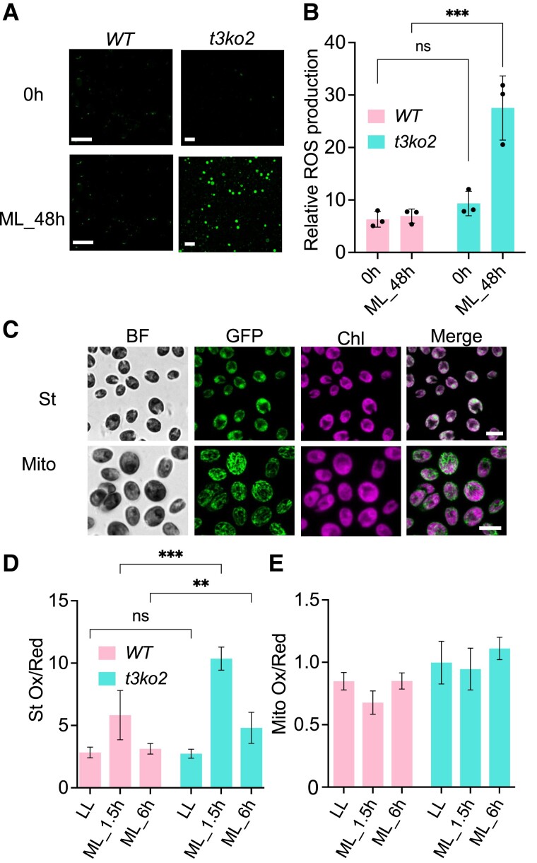 Measurement of intracellular ROS in t3ko2 and WT upon transition from LL to ML. A) ROS levels were evaluated by CM-H2DCFDA fluorescence of WT and the t3ko2 mutant in LL and following exposure to ML for 48 h. Scale bars, 20 μm. B) Quantitation of data in A). Shown are mean values from 3 independent experiments ± Sd. C) roGFP2 protein targeted to the chloroplast stroma (upper panel) or mitochondrion (lower panel). Scale bars: 10 μm; BF, bright field; GFP, roGFP2 fluorescence; Chl, chlorophyll autofluorescence. D to E) Monitoring redox levels in the stroma D) or mitochondrion E) after exposure of WT and the t3ko2 mutant for 1.5 or 6.0 h of ML. Shown are mean values from 3 independent experiments ± Sd; 3 to 4 random images were analyzed for each experiment. For panels B) and D), the asterisks represent significant differences determined by ANOVA tests. **P < 0.005 and ***P < 0.001.