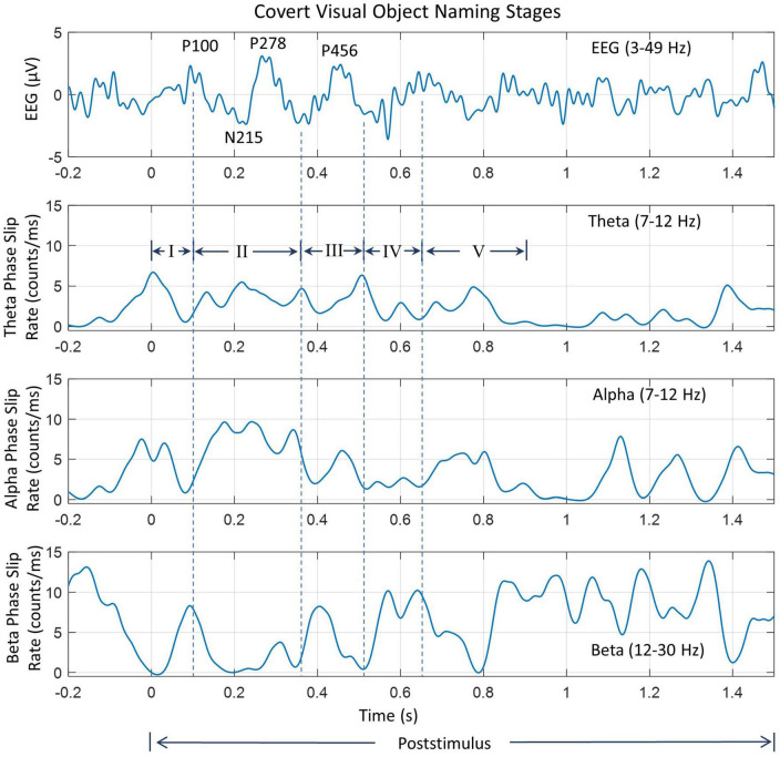 Analysis of insight stages during the post-stimulus period. The top plot is the EEG (3–49 Hz) from one of the electrodes in the left visual occipital area, the back of the head. Prominent peaks are marked. The following three plots are for phase slip rates in the theta, alpha, and beta bands, respectively. Vertical dashed lines mark the location of different stages of insight moments. Stage III is the “Eureka” moment.