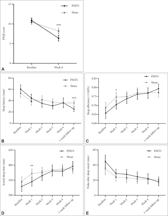 PSQI scores and weekly sleep diary-derived value of the PMTS group and the sham group. A: PSQI score. B: Sleep latency. C: Sleep efficiency. D: Actual sleep time. E: Wake after sleep onset. Error bars indicated ±95% CI. *pbetween-group<0.05; **pbetween-group<0.01; ***pbetween-group<0.001. PMTS, Pulsed Magnetic Therapy System; PSQI, Pittsburgh Sleep Quality Index; CI, confidence interval.