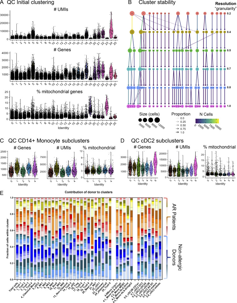 QC of transcriptomic dataset. (A) Parameters used for QC of transcriptomic clusters. (B) Cluster stability analysis for different values of granularity parameter (“resolution”) used in Phenogrpah clustering. 0.5 was used for clustering in the manuscript. (C and D) Parameters used for QC of transcriptomic monocyte (C) and cDC2 (D) subclusters. (E) Contribution of each donor to each cluster shows that no donor-/condition-specific clusters exist.