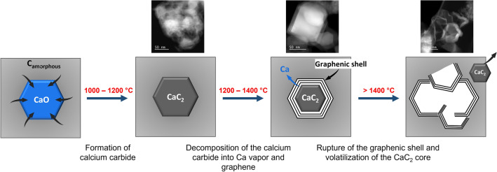 From the XRD and TEM analyses, temperature appears to be the main factor driving the catalytic graphenization. Below 1200 °C, no catalytic effect of calcium is observed, and the calcium is mainly under the form of CaO particles embedded in an amorphous carbon matrix. However, formation of graphenic structures is observed around calcium oxide particles at 1400 °C on the TEM images. This observation is similar to the literature on iron-catalyzed graphenization. It is explained that the amorphous carbon dissolves in the metal catalyst to form an intermediary metastable carbide, and then precipitates into a graphenic shell around the catalyst upon cooling24,27. This mechanism fits well with calcium, as calcium oxide is known to react with carbon to form a calcium carbide around 1300 °C41: