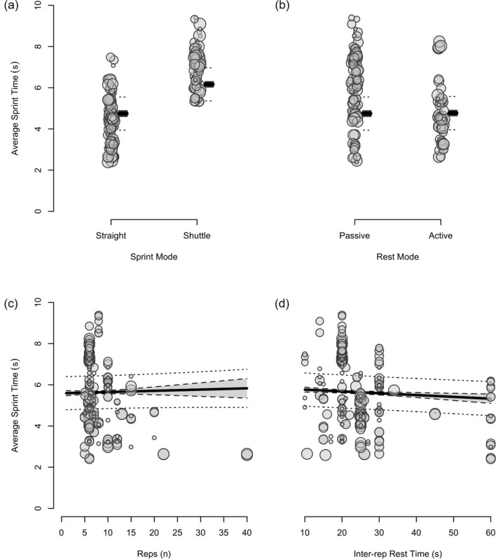 To examine the effect of programming variables on acute RST outcomes, candidate factors were added to the aforementioned baseline models as fixed effects for outcomes with sufficient estimates available (approximately 10 per moderator [73]). The five moderator variables were: sprint modality (categorical: straight-line or 180° shuttle), number of repetitions per set (continuous, linear), total distance covered in each repetition (continuous, linear), inter-repetition rest modality (categorical: active or passive) and inter-repetition rest duration (continuous, linear). Factors were re-scaled so that the reference (intercept) effect represented the performance or response to 6 m × 30 m straight-line sprints with 20 s passive rest between repetitions. The effects of each moderator were then estimated (along with 90% CI and 90% prediction intervals, where appropriate), with all other factors being held constant. Categorical moderators were given as the difference between levels (shuttle compared with straight-line sprints and active compared with passive inter-repetition rest). Continuous moderators were evaluated at a magnitude deemed to be practically relevant for training prescription: performing two more repetitions, sprinting 10 m further per repetition and resting for 10 s longer between repetitions. The effects of repetition distance on repetition time (average and fastest sprint) were not shown (but were still offset to a distance of 30 m), because the time taken to complete a sprint repetition is almost entirely dependent on the distance to be covered. The total amount of variance explained by the combination of moderators was given as a pseudo-R2 value, calculated by subtracting the total (pooled) variance from final models () as a fraction of baseline models () from 1 (1 − ).