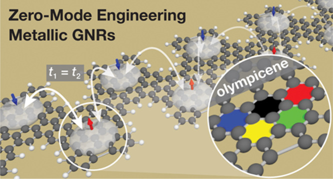 We herein demonstrate the versatility of ZM engineering for introducing robust metallicity in 1D GNRs. A Cs symmetric molecular building block undergoes a regiocontrolled on-surface polymerization to yield homogeneous samples of 5-oGNRs featuring a symmetric superlattice of ZM states along the GNR backbone. Guided by elementary tight-binding analysis, we pioneer the design of 5-oGNRs around a strong nearest-neighbor hopping interaction between electrons in adjacent ZM states, giving rise to a large ZM bandwidth that is insensitive to Peierls and Stoner metal–insulator transitions. First-principles DFT-LDA calculations and STS corroborate the emergence of metallic ZM bands in 5-oGNRs. The design and synthesis of robust, metallic GNRs pave the way toward the realization of energy-efficient integrated circuit architectures based on low-dimensional carbon materials that are capable of high-speed electronic37,38 and quantum information processing.39,40