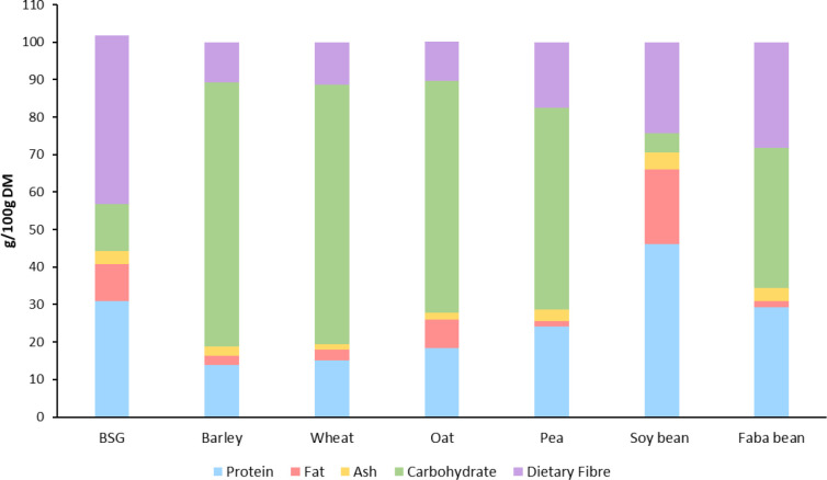 Proximate composition of BSG, unmalted barley, wheat, oat, pea, soy bean, and faba bean.15,20−22,25,26