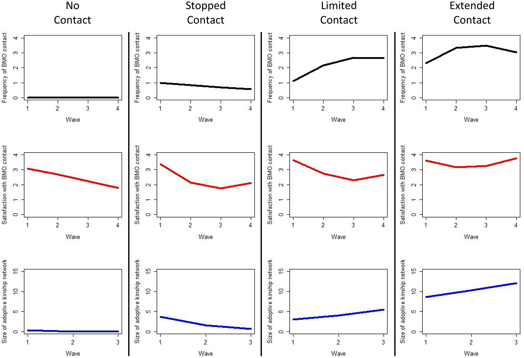 Adopted persons in the ‘No Contact’ group (41.6% of the sample) typically had no contact with birth family members over time, associated with a linear decline in satisfaction with lack of contact. Some adopted persons expressed an interest in contact to fill gaps in their health history. Others expressed an openness or desire to have contact with birth family members, but with some degree of ambivalence about how much contact they would like. Adopted persons in the ‘Stopped Contact’ group (13.7%) typically had some contact with birth family members initially that decreased and ultimately stopped. Satisfaction also declined and leveled off at a moderate level. For some group members, contact appeared to fade over time for various reasons, including moves and busy lives. For others, it ended more abruptly due to conflicts between adoptive and birth family members. Adopted persons in the ‘Limited Contact’ group (26.3%) typically experienced increased frequency of contact with their birth mother and a level of cross-network contact that increased slightly but remained small. Satisfaction began high and decreased over time, rebounding slightly in young adulthood. Some group members emphasized how relationships with birth family members remained limited; some were satisfied with this situation, whereas others desired more contact. Others cited challenges in navigating increases in contact, such as managing differing expectations about level/intensity of desired contact. Lastly, adopted persons in the ‘Extended Contact’ group (18.4 %) typically reported high frequency of birth mother contact over time and a level of cross-network contact that began high and increased. Satisfaction began and remained high. Group members considered birth relatives as extended family members and noted continued interactions between adoptive and birth family members as “normal.” Also mentioned was the relational work needed to maintain contact throughout the years, such as the need for ongoing communication and consideration of others’ feelings.