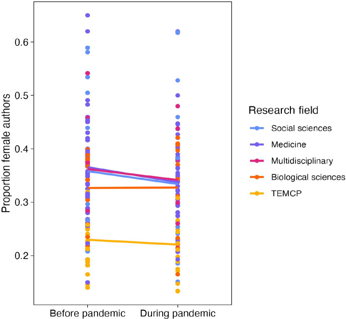 Each point shows the proportion of female authors before (left) or during (right) the pandemic. The solid lines connect the mean value for each research field before and during the pandemic. The largest decreases are observed for the three fields that had the highest proportions of female authors (social sciences, medicine and multidisciplinary). TEMCP reflects the technology, engineering, mathematics, chemistry and physics fields, and multidisciplinary includes studies that span fields.