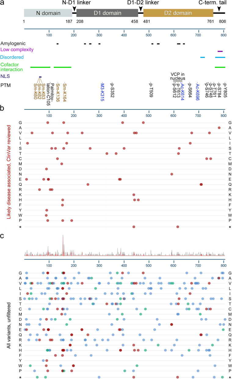 VCP regions, interaction sites, PTMs, and variants. a The domain organization, regions relevant to aggregation and interactions (amyloidogenic, low complexity, major sites for cofactor interaction), subcellular targeting (nuclear localization sequence, NLS), and PTMs with known impact on VCP localization or function are depicted. Sm, sumoylation; M3, tri-methylation; Ac, acetylation. b Likely disease-associated variants (neurodegeneration and other conditions) are depicted; they have been curated from ClinVar (NIH). The variants are linked to different diseases and disorders, such as neurodegeneration and cancer. c VCP variants linked to disease (red), with predicted consequences (blue), likely benign (light green), or with uncertain outcomes (dark green) are shown. The distribution of mutations appears on top of the table. b, c The variant amino acid residue is shown at the margins in the one letter code. * indicates nonsense mutations. The figure has been generated with information from multiple sources [135, 138, 139, 151, 152]