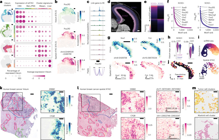 a, Visium gene expression signature scores for differentially accessible genes in spatial ATAC (sATAC) clusters. Visium clusters (left) on an E12.5 section for reference. CNS, central nervous system; Men./PNS, meninges/peripheral nervous system; and Mesen., mesenchyme. b, Pou3f2 expression (top, cyan), gene activity and accessibility of a co-accessible distal regulatory element (magenta). c, Genomic track and co-accessibility scores for peaks around the Pou3f2 locus. The distal element shown in b is highlighted in gray and tracks are colored according to spatial ATAC clusters. d, Inset of a SOX2-immunostained E15.5 spatial ATAC section (n = 2) with highlighted SOX2+ (progenitor, pink) and SOX2− (neuronal, purple) regions. e, Top 500 differentially accessible peaks by fold change in SOX2+ and SOX2− regions. Avg. acc., average accessibility. f, Motif enrichment analysis of peaks from e. Selected motifs for transcription factors expressed in the region are highlighted. P values by a one-sided hypergeometric test. g, Accessibility (Acc.) (spatial ATAC; magenta) and expression (expr.) of the nearest gene (Visium; cyan) for loci enriched in progenitor (Sox1) or neuronal (Fyn) regions. h, Gene signature score in lower and upper cortical regions for differentially accessible genes in SOX2+ and SOX2− regions. i, UMAP of integrated single-cell RNA-seq and spatial ATAC from the E15.5 developing cortex colored by pseudotime and split by technology. P values by Wilcoxon test (***<0.001). j, Pseudotime scores projected onto their spatial locations in a spatial ATAC E15.5 section. k, Hematoxylin and eosin image of a breast cancer section processed using Visium (n = 1) with overlaid pathologist annotations. Expression of ERBB2 (HER2) and myeloid cell marker C1QB in the boxed inset. l, Annotated hematoxylin and eosin image of an adjacent (200 µm) section processed using spatial ATAC (n = 3). On the right, accessibility of the ERBB2 locus, C1QB locus and two associated regulatory regions in the boxed inset (right). m, Spatial interaction between tumor cell and myeloid cell clusters at the tumor interface. Pathology is denoted as follows: red, invasive cancer; blue, tumor infiltrating lymphocytes; green, intravascular cancer and yellow, normal gland. Scale bars, 500 µm.
