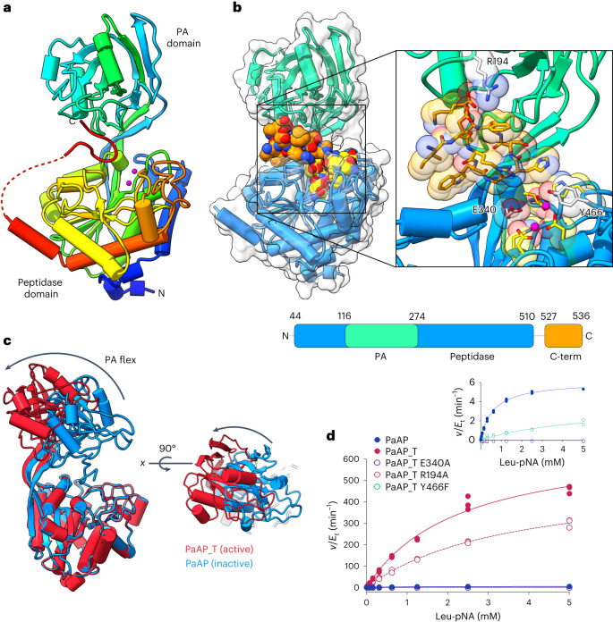 a, The crystal structure of WT PaAP. The secondary structure is colored in rainbow, blue N-terminus through to red C-terminus. Pink spheres are zinc ions that indicate the location of the active site. A short region of disorder between the C-terminus and the peptidase domain is shown by a dashed red line. b, Structure of PaAP with surface displayed demonstrates the closed inactive conformation. PA domain is shown in turquoise and peptidase domain in blue. The active site (yellow residues) is occluded by the C-terminus (orange residues), which binds in a groove between the PA and peptidase domains. c, The structure of WT PaAP (blue) in comparison to the PaAP_T (red), which lacks the C-terminus, illustrates the conformational change of the PA domain, which allows access to the active site. A Supplementary Video depicts this conformational change. d, The activity of WT PaAP versus PaAP_T (solid circles) and PaAP_T variants (white circles). PaAP shows higher activity upon removal of the inhibitory C-terminus. The inset panel on the left shows zoomed-in view of v/Et values to show the reduced activity of other PaAP forms. Experiments were performed in triplicate.
