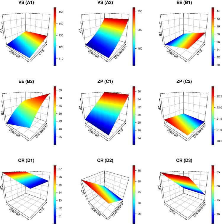 The optimized formulation was developed through Design-Expert Software (12.0.3.0, Stat-Ease Inc., USA). The trials were designed using three independent variables (Span 60 amount, cholesterol amount, and CTS concentration), as shown in Table 1, with Span 60 ranging from 40 to 120 mg, cholesterol ranging from 15 to 30 mg, and CTS concentration ranging from 0.1 to 0.4%. The dependent variables chosen for the formulation were vesicle size (VS), zeta potential (ZP), entrapment efficiency (EE), and cumulative release after 8 h (CR). Based on this, 16 different runs (12 formulations and 4 repeated central points) were designed using Box Behnken design (BBD). 3D surface graphs are plotted in the R program using the plot3D package (Panda et al., 2021; Soetaert, 2017). The optimization constraints were designed to maximize ZP, EE, and CR and minimize VS (Eid et al., 2022; Elkomy et al., 2022c).
