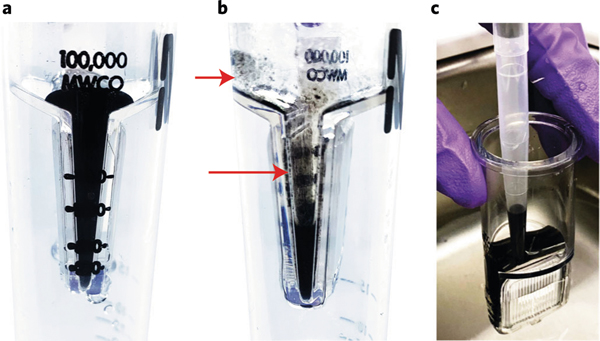 | Too much solution was passed through the filtration membrane during washing | Always keep the membranes submerged in the reaction solution to prevent pelleting of SWNTs on membranes. If more liquid than desired is passing through and the membrane surface is exposed, decrease the centrifugation speed and/or time | ||