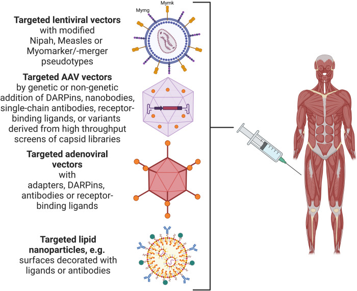 Targeting principles for delivery of gene therapies. Hindi et al. report on a novel strategy to selective target skeletal muscle cells in vivo by transducing activated stellate cells with lentiviral vectors equipped with the muscle-specific fusogens Mymg and Mymk. This adds to the available strategies of changing the tropism of lentiviral vectors. Current strategies employ pseudotyping with Nipah virus or Measles virus-derived surface glycoproteins that are blinded for their natural tropism and equipped with new targeting specificities, e.g. peptides, antibodies, DARPins. Similarly, non-enveloped viral vectors such as adeno-associated viruses or adenoviral vectors can be equipped with DARPins, nanobodies, single-chain antibodies, or receptor-binding ligands either genetically or non-genetically (modified sites for specific targeting are indicated as orange circles). The key to obtaining a re-directed tropism is the combination of blinding the particle for the natural receptor usage with insertion of targeting moieties. Cell surface targeting technologies have more recently also been expanded to lipid nanoparticles to broaden their in vivo usage. Targeted delivery strategies can be exploited for the expression of transgenes and tools for RNA interference as well as gene/base editing. Figure created with BioRender.com