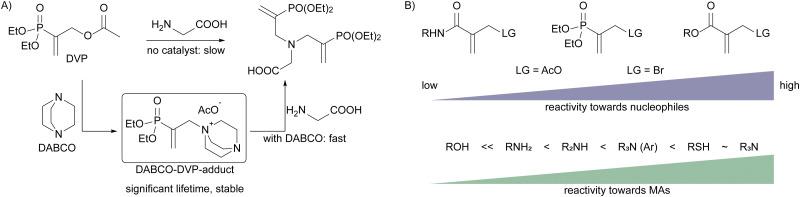 Scheme 4. (A) Diethyl(α-acetoxymethyl)vinylphosphonate (DVP) reacts slowly with glycine to form a double adduct of DVP on glycine. In the presence of DABCO, this reaction proceeds roughly 15-fold faster via a DABCO-DVP adduct, which possesses a significant lifetime and can be isolated. (B) Depending on the electron-withdrawing group (EWG) and leaving group (LG), MAs possess vastly different reactivity towards nucleophiles, just as different nucleophiles show different reactivity towards MAs. These trends can act as a general guideline for the reader.