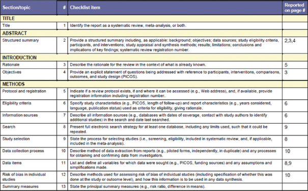 The data was analyzed using the “best fit” framework synthesis and the Preferred Reporting Items for Systematic Reviews and Meta-Analyses (PRISMA) checklist [Figure 2]. The steps in the best fit framework are a systematic identification of relevant primary research studies, the identification of relevant publications using search strategy, the extraction of data based on characteristics identified in the appraisal for quality, coding of the evidence, creation of new themes by conducting thematic analysis on the evidence and producing a new framework composed of a prior and new themes supported by the evidence. The key study also used main articles selected in the scanning search and created an all-inclusive search strategy that involved appropriate text-word and therapeutic subject[15] [Figure 1].
