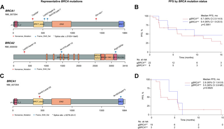 By tumor type, 8 of 10 (80%; 4 CR) patients with platinum-sensitive OC and 6 of 17 (35.3%; 1 CR) patients with platinum-resistant OC achieved confirmed objective response; additional 3 (17.6%) patients with platinum-resistant disease had unconfirmed PR. One (10%) patient with platinum-sensitive OC and 7 (41.2%) patients with platinum-resistant OC had SD, resulting in a DCR of 90.0% (9/10) for platinum-sensitive OC and 76.5% (13/17) for platinum-resistant OC. In responders, median DoR was 9.3 months (95% CI 7.4-not reached [NR]) in patients with platinum-sensitive OC and 18.4 months (95% CI 12.0-NR) in those with platinum-resistant OC (Table 3). By data cutoff, median PFS was 12.1 months (95% CI 1.9-NR) in patients with platinum-sensitive OC and 5.8 months (95% CI 2.1–18.5) in those with platinum-resistant OC. According to BRCA mutation status, the proportion of OC patients achieving confirmed objective response (62.5% [5/8] vs 40.9% [9/22]) and disease control (87.5% [7/8] vs 68.2% [15/22]) was numerically higher in those with gBRCA1/2mut disease than with gBRCA1/2 wild type (gBRCA1/2wt) disease (Additional file 1: Table S3); the median PFS was 9.4 months (95% CI 1.9–20.5) in patients with gBRCA1/2mut OC and 6.7 months (95% CI 2.0–14.9) in those with gBRCAwt OC (p = 0.3951; Fig. 3A, B). In patients who had platinum-sensitive OC, all 3 patients (100%) with gBRCA1/2mut and 5 of 7 (71.4%) patients with gBRCAwt had an objective response; in patients with platinum-resistant OC, an objective response was observed in 2 of 4 (50.0%) of patients harboring gBRCA1/2mut and in 4 of 13 (30.8%) patients harboring gBRCAwt.