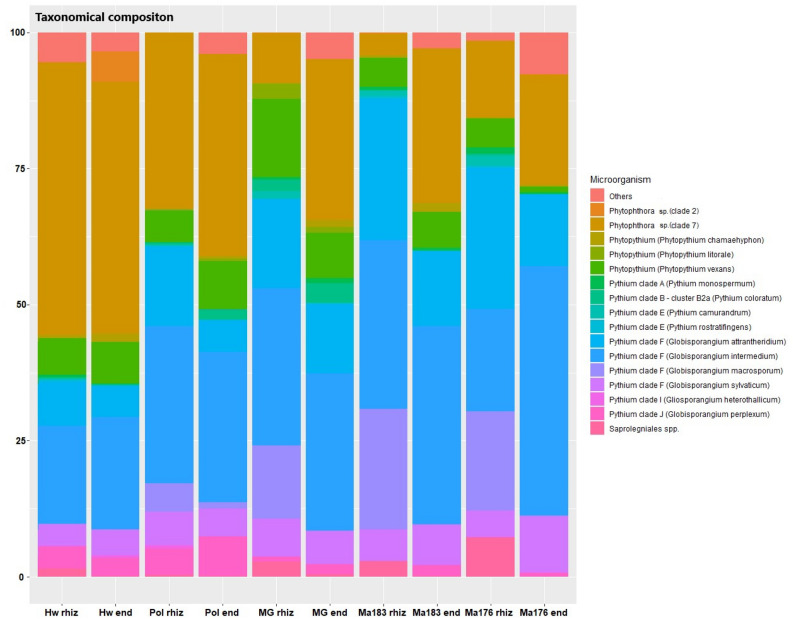 Taxonomic composition of the oomycetes found in the rhizosphere and endosphere of different Actinidia spp. at the time of full symptom development. Hw: A. deliciosa cv. Hayward, Pol: A. polygama, MG: A. arguta cv. Miss Green, Ma183 and Ma176: A. macrosperma. rhiz: rhizosphere, end: endosphere. Data are expressed as relative abundance (%) given by the number of reads for each microorganism on the total number of reads.