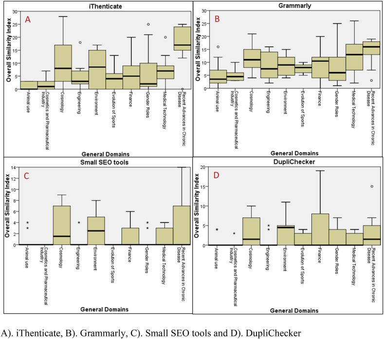 A total of 100 articles generated by an AI software, ChatGPT were included in the study (See Table 2). The study flowchart has been illustrated in Supplementary Fig. S1. The overall similarity index data for each software was found to be non-normally distributed (See Supplementary Fig. S2). The number of words and complexity of words indices were found to be normally distributed. The Median (IQR) for OSI generated by Grammarly was 8.50 (4–13) being the highest, while iThenticate, DupliChecker and Small SEO tools had Median (IQR) of 4 (0–11.75), 0 (0–4), and 0 (0–2.75), respectively (See Fig. 1). The OSI values produced by iThenticate, Grammarly, and Small SEO tools exhibited significant variations among the 10 general domains (p < 0.05). In contrast, DupliChecker did not yield any noticeable difference among the groups (p > 0.05) (See Fig. 2A, B, 2C, 2D and Supplementary Table S1).