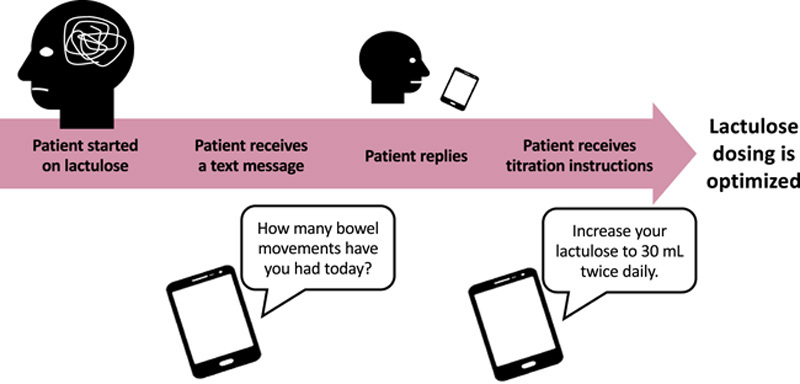 Use of mobile technology to titrate lactulose. Patients taking lactulose require monitoring to avoid excessive bowel movements and subsequent dehydration. Such monitoring can be achieved with just-in-time text messages or other mobile technology.