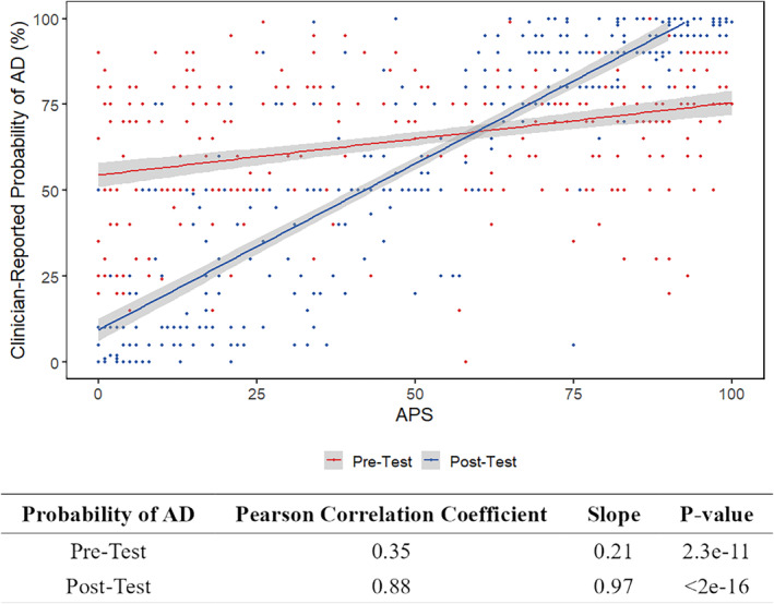 The concordance between APS with clinician‐reported probability of AD differed pre‐ and post‐PrecivityAD blood testing (Fig. 3). Clinician‐reported pretest probability of AD had a weak positive correlation with APS (Pearson correlation coefficient of 0.35, slope of 0.21, p < 0.0001), while post‐test probability of AD had a strong positive correlation with APS (Pearson correlation coefficient of 0.88, slope of 0.97, p < 0.0001).