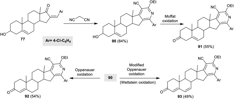 Similarly, the reaction of steroidal α,β-unsaturated ketone 77 with malononitrile gave pyridosteroid 90 in an excellent yield. Moffat oxidation of 90 yielded the corresponding ketone 91, while Oppenauer oxidation gave the α,β-unsaturated ketone 92. Wettstein oxidation is an organic chemical process used to oxidize 3-β-hydroxysterol to 3-ketosterol. The reaction medium is an alkaline environment, and the 3-β-hydroxysterol is heated with DDQ. Wettstein oxidation of pyridosteroid 90 yielded desired dienone 93 in a moderate yield (Scheme 20).67