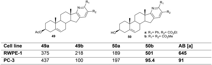 Abiraterone (I)11,12 has been applied in the clinical field for the treatment of prostate cancers, in which its performance is related to the incorporation of a pyridine ring. The lone pair of electrons on the nitrogen atom enables the formation of a coordination bond with the heme-iron atom at the active site of the enzyme.13 A series of 5α-reductase inhibitors (II) demonstrated respectable in vitro anti-proliferative activity against PC-3 cell lines.14 In recent research, steroidal pyridines (III) exhibited potential cytotoxic activity on prostate cancer cells utilizing the abiraterone “androgen inhibitor” as a control drug.15 In addition, androst[17,16-b] pyridines (IV) revealed a moderate cytotoxic effect on PC-3 cells, in which most of the cells treated with this steroid died at the higher dose (165 μM).6 Furthermore, heterosteroids (structures V and VI) have displayed potent anti-inflammatory activities (Fig. 1).16