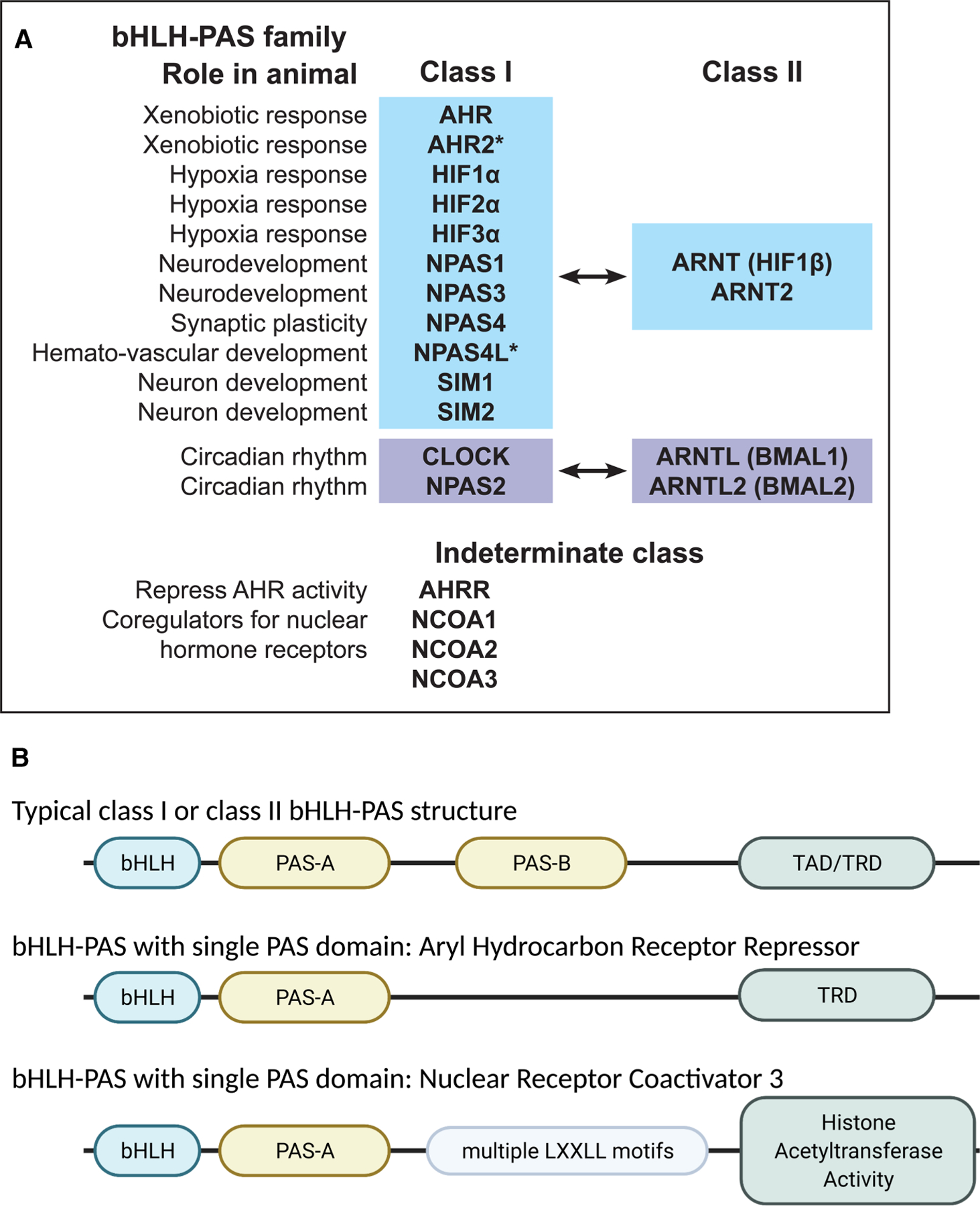 The basic helix-loop-helix Per-Arnt-Sim family of proteins (bHLH–PAS) are transcription factors that regulate diverse biological functions (Figure 1). bHLH–PAS proteins are present throughout the animal kingdom and contain several conserved functional domains: a bHLH domain at the N-terminus that facilitates binding to DNA, two tandem PAS domains (PAS-A, PAS-B), and a domain at the C-terminus that activates or blocks transcription of target genes (Figure 1B). bHLH–PAS proteins are divided into two classes based on their dimerization properties. Class I bHLH–PAS proteins are typically specialized transcription factors that are activated in response to a stimulus such as a small molecule ligand, oxygen levels or neuronal activity. Class II bHLH–PAS proteins, which are often widely expressed, dimerize with class I proteins to form a functional transcriptional complex. The expression patterns of class I and class II proteins, together with the stimulus-dependent activation of class I proteins, allows bHLH–PAS protein heterodimers to activate or repress target genes in a spatially and temporally distinct manner. In this article, we will review the general structure and functions of the bHLH and PAS domains from bHLH–PAS proteins throughout the animal kingdom, focusing on animals commonly used in biomedical research. We highlight bHLH–PAS family members that contain only one PAS domain and do not fit neatly into the class I-class II organization. We discuss heterodimerization between class I and class II bHLH–PAS proteins, binding partner selectivity and functional redundancy. Some class II bHLH–PAS proteins may form homodimers, while some class I proteins may have functions other than as transcription factors. Finally, we discuss the evolution of bHLH–PAS proteins, and why a class I protein essential for cardiovascular development in vertebrates like chicken and fish is absent from mammals.