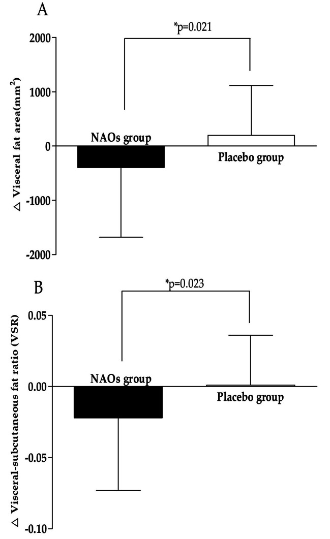 After 16 weeks of intervention, the group administered with NAOs had statistically significant decreases in visceral fat area and visceral-subcutaneous fat area ratio compared to the placebo group. The NAOs group suppressed the increase in weight and BMI compared to the placebo group, which was significant between groups. High-density lipoprotein- cholesterol was increased in the group administered with NAOs, which showed a significant trend compared to the placebo group. Clinical changes were not observed for any safety biomarkers.