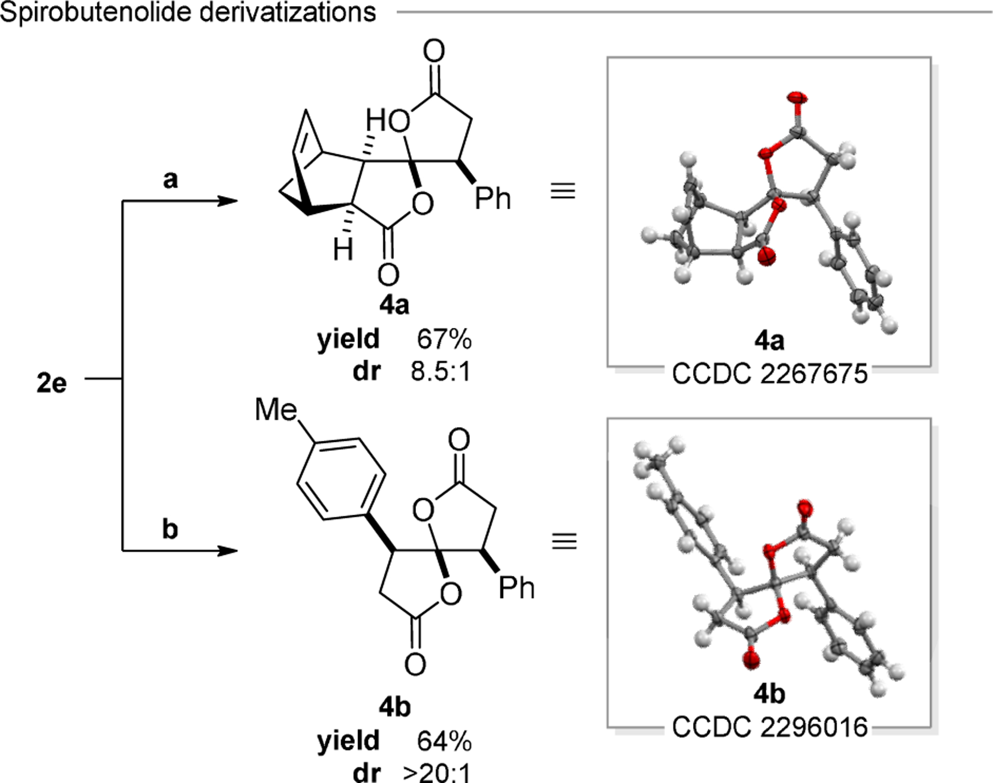 Derivatizations of the γ-spirobutenolide products were investigated (Figure 2). Spirobutenolide 2e readily participated in a Zn(II)-catalyzed Diels–Alder cycloaddition with cyclopentadiene to afford tetracycle 4a in 67% isolated yield as an 8.5:1 mixture of separable diastereomers. The relative configuration of the major diastereomer was established by X-ray crystallography, revealing the major stereoisomer to be the endo product resulting from the diene approach syn to the oxygen of the saturated lactone. Rhodium(I)-catalyzed arylation of spirocycle 2e proceeded with high diastereoselectivity (>20:1 dr), and spirolactone 4b was isolated in 64% yield. The relative stereochemistry of bis(lactone) 4b was established by X-ray crystallography; the observed diastereomer results from addition syn relative to the oxygen in the butyrolactone of spirocycle 2e (see Supporting Information for discussion of related literature examples).11