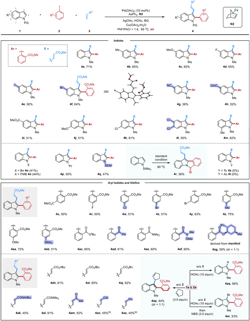 With the optimized reaction condition in hand, the substrate scope was examined (Table 2). A range of indoles with various substituents at the C5, C6 and C7 positions, including alkyl (4b and 4m), methoxy (4c and 4j), halogen atoms (4d-4f and 4k-4l), cyano (4g), aldehyde (4h) and ester (4i) groups were all suitable for this transformation. Note that aryl iodide moieties, which are reactive in Pd(0)-catalyzed cross-coupling reactions, were tolerated under the current reaction condition, which can allow for further derivatization. The X-ray structure of 4f was obtained to confirm the regioselectivity of this difunctionalization method.[14] Besides methyl groups, N-benzyl, p-methoxybenzyl (PMB), isopropyl, and trimethylsilylethoxymethyl (SEM)-substituted indoles can also undergo the desired difunctionalization smoothly with moderate yield (4n-4q). The reduced efficiency is possibly attributed to the increased steric hindrance. Notably, the use of N-trimethylsilyl indole led to the direct isolation of a tetracycle product (4r), in which the N-silyl group was first removed and the resulting deprotected indole attacked the ester moiety during the reaction. Other indole derivatives protected by electron-withdrawing groups, such as Ts (4s) and Ac (4t), failed to yield any products, suggesting that the initial C─H palladation may be difficult with these less electron-rich substrates.