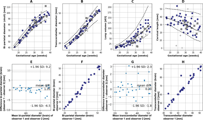Plots show anatomic measures obtained at anatomic two-dimensional fast-spin-echo fetal 0.55-T MRI in the healthy pregnant participant cohort at different gestational ages. (A) Biparietal diameter of the brain (skull), (B) transcerebellar diameter, (C) fetal lung volume measured on coronal T2-weighted fast-spin-echo sequences, and (D) length of the cervix from internal to external os measured on sagittal T2-weighted fast-spin-echo sequences (cervical length). The black line shows the regression analysis from respective large literature studies on normative values and the dotted lines the reported 5th and 95th quartile ranges. Squares and crosses mark the pregnant participants with a neurological finding and a placental pathology or diabetes type I, respectively. (E, G) Bland-Altman plots show differences (diff) in biparietal diameter and transcerebellar diameter measurements between two observers, and (F, H) scatterplots show the biparietal diameter and transcerebellar diameter of all cases as observed by both observers.