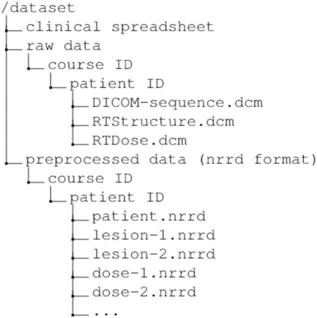 This public dataset retrospectively involved a total of 47 brain cancer patients with 21 males and 26 females. The dataset can be described in three ways: 1) patient-level, 2) course-level, and 3) lesion-level. Patient-level keeps all the data related to a specific patient altogether. Each course-level treatment data has been stored for each patient. Among all the patients, 17 patients received more than one course of treatment, 7 received more than two courses, and 1 patient received up to eight courses in total. Regarding the lesion-level, a total of 244 lesions were collected with annotations. 221 lesions are stable, and 23 are recurrence, which makes the dataset imbalance from the lesion-level perspective. Data files are organized through the flow of course-patient-lesion. The detailed data file directory structure is shown in Fig. 4. In terms of data format, we provide initial DICOM format MRI files for each patient. Lesion annotations and dose plan information are stored in RTStructure and RTDose, respectively. In addition to DICOM format, we provided Nearly Raw Raster Data (NRRD) format for neuroscience research support. NRRD is less complicated compared with DICOM while preserving essential metadata. Researchers can directly access those data formats without a start with processing RTStruct files. Additionally, all the preprocessed MRI images have been saved in numpy array format, which can facilitate the implementation in Python or other programming languages. Two sections of the data can be downloaded and studied separately. Different from the DICOM format usage where patient data consists of many slices, each patient MRI is retained in one single array along with the patient’s cropped lesion arrays. Corresponding dose information has also been extracted from RTStructure as a separate array file.