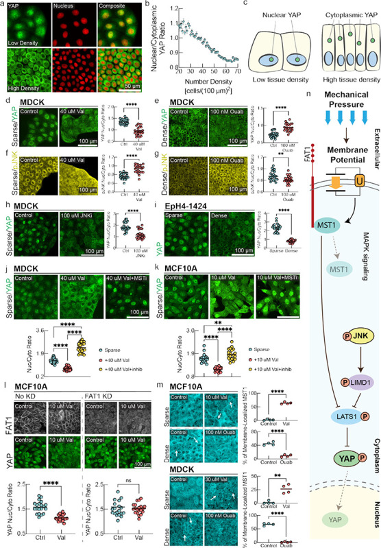 a, YAP immunostaining and fluorescent nuclei images in low density (top panel) and high density MDCK monolayers (bottom panel). b, Quantification of nuclear/cytoplasmic YAP ratio as a function of cell number density. (mean ± s.d., n = 20337, cells binned together by local number density). c, Schematic representation of YAP localization at different cell number densities. d-g, Immunostaining of MDCK cells for YAP and phosphorylated JNK (pJNK) under sparse (left panels) and dense (right panels) conditions with corresponding drug perturbations.d-e, the nucleus/cytoplasm ratio of YAP is measured. d, In Sparse cells, YAP localizes to the nucleus and induction of hyperpolarization significantly promotes nuclear exclusion of YAP. e, in dense confluent cells, depolarization by ouabain inhibits nuclear exclusion of YAP as compared to the control. In the plots, the line is at mean, n=24, and p-value is measured with an unpaired t-test and is <0.0001 unless otherwise specified. f, pJNK predominantly localized in cytoplasm in sparse MDCK cells. Induction of hyperpolarization by valinomycin promotes increased nuclear localization of pJNK. g, In dense confluent cells, depolarization by ouabain promotes nuclear exclusion of pJNK as compared to the control. h, JNK inhibition promotes significant nuclear exclusion of YAP in sparse MDCK cells. i, In Eph4-1424 cells, YAP nuclear localization follows the canonical density dependence of YAP nuclear-cytoplasmic shuttling. j-k, YAP immunostaining of sparse MDCK/MCF10A cells with control, valinomycin, and valinomycin with MST inhibitor (XMU-MP-1) conditions. The p-value between sparse and valinomycin+MSTi conditions is 0.0092. l, Sparse MCF10A cells with and without FAT1 knockdown (KD) are stained for FAT1 and YAP under control and valinomycin conditions. The nucleus/cytoplasm ratio for FAT1KD cells under control vs valinomycin has a p-value of 0.558 (ns). l, MST1 immunostaining of MCF10A/MDCK cells under sparse control, sparse valinomycin, dense control, and dense ouabain conditions. White arrows highlight areas of increased MST1 organized membrane clusters. For quantifications in panels. m, localization of MST1 in individual cells in randomized fields of view were analyzed. The line is at mean, n=4 ROIs, and p-value is measured with an unpaired t-test. The p-value is 0.0012 for MDCK sparse control v. valinomycin and <0.0001 for other plots. n, Schematic diagram summarizing signal transduction mechanism mediated by membrane potential. Depolarization of membrane potential activates cytoplasmic pJNK, which activates LIMD1 to inhibit LATS1, causing YAP to translocate to the nucleus. In parallel, hyperpolarization of membrane potential causes MST1 to colocalizes with the c-terminus tail of FAT1, assembling the Hippo signalome. This Hippo ‘on’ state prevents the nuclear translocation of YAP.