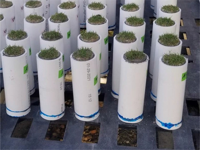 The first enhanced degradation experiment used soil collected from the small plots. Twelve 5-cm-diam. ×15.2-cm deep cores were collected from each of the small plots using an AMS sediment sampler (AMS, American Falls, ID). The samples were collected from the center of the 1.5 m2 plots with care taken to avoid the edge of the plots. Plastic liners were inserted into the steel core sampler to hold the intact sample (Fig. 1) and the sampler was pounded into the soil until it was flush with the turf surface. Cores were collected July 2021 for the first repetition and October 2021 for the second repetition. To keep the cores intact and minimize impacts to the microbial community, the liners containing the intact cores were placed directly into custom-made 5-cm-diam. × 15.2-cm deep PVC tubes with a mesh bottom (Fig. 2), and maintained in greenhouses on the University of Florida campus in Gainesville, FL.