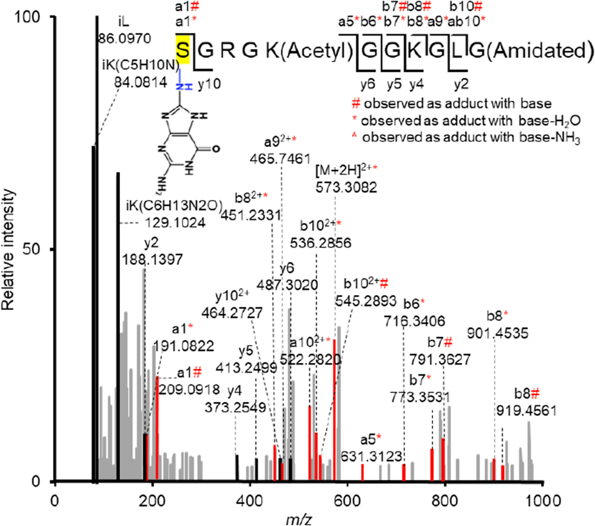 MS/MS spectrum of H4 1–11-K5-Ac (M = 1013.5720) containing C8-Lys-dG (M of base = 149.0338) obtained from photolysis of 3 and 4 detected by LC–MS/MS (exp. m/z = 582.3145, calcd m/z = 582.3107). Color code: Ions containing modification, red; unmodified ion, black; ion from other peptide(s), gray.