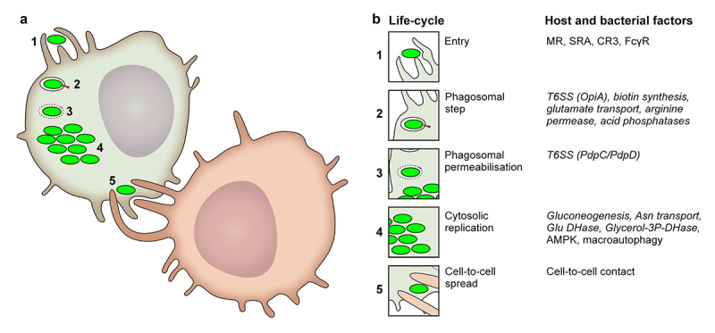 (a) Schematic representation of Francisella life cycle in macrophages. Merocytophagy of uninfected macrophages (red) is shown in panel 5. (b) For each step in the life cycle, the main host and bacterial factors (in italics) are shown.