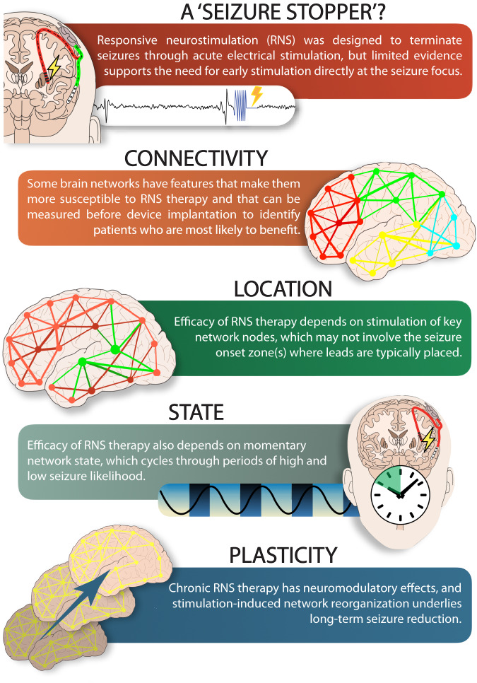 Recent studies exploring structural and functional network connectivity within the brain, the timing of stimulation relative to dynamic brain states, and markers of neural plasticity provide some explanation for these unexpected clinical observations. Although the RNS clinical trials were not powered for subgroup comparisons based on clinical or imaging features, there is emerging evidence that some brain networks may be intrinsically more responsive to RNS stimulation than others. Retrospective analysis of intracranial electroencephalography (EEG) in patients who were later treated with RNS revealed that ictal synchronizability, a metric reflecting the ease by which neural activity propagates through a functionally connected brain network, is inversely related to the degree of seizure reduction with RNS therapy29. Thus, RNS responders and non-responders can be distinguished prior to device implantation based on a biomarker derived from electrographic features of their seizures. Another recent study using pre-RNS magnetoencephalography (MEG) found that interictal global functional connectivity in certain frequency bands was lower in RNS non-responders compared with responders30. Taken together, it would seem the effectiveness of RNS therapy depends on intrinsic neurophysiological properties of seizures and the brain networks that give rise to them. For example, a speculative possibility is that interictal RNS stimulation can more readily diffuse through networks with high functional connectivity, which could potentiate its therapeutic effects, and that seizures less able to synchronize widespread networks are those most readily reduced by RNS stimulation.