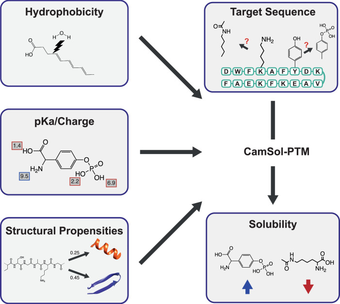 Posttranslationally modified amino acids are crucial in physiology and drug development as they alter physicochemical properties such as the solubility of proteins. Here the authors describe CamSolPTM, a software that accurately predicts the solubility of proteins containing these residues.