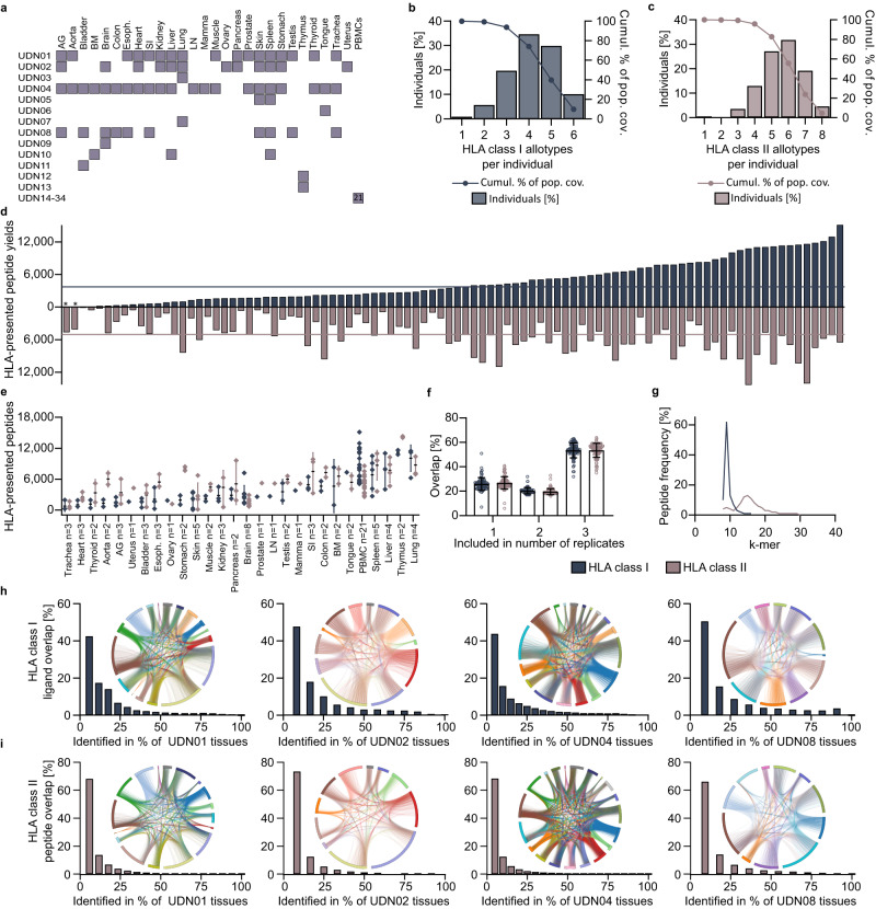 a Sample overview included in the benignTOFIMS dataset. b, c Population coverage of the HLA class I (b) and HLA class II (c) allotypes of the benign sample cohort compared to the world population determined by the IEDB population coverage tool46. Frequencies of individuals within the world population carry up to 6/8 allotypes (x-axis) are indicated as bars on the left y-axis. The cumulative percentage of population coverage is depicted as dots on the right y-axis. d HLA class I (top) and HLA class II (bottom) ligand yields of the primary benign tissue samples of various origins (n = 94). Median peptide yields are indicated as lines and samples marked with asterisk were only characterized for HLA class II-presented peptides. e Tissue specific HLA class I and HLA class II peptide yields of the benignTOFIMS dataset (n = 94 biologically independet samples). Mean peptide yields ± standard deviation are depicted with error bars. f Percentage of peptides included in one, two or three technical replicates within one sample in the benign dataset (n = 94 biologically independet samples). Mean peptide overlap ± standard deviation are depicted with error bars. g HLA class I and HLA class II peptide length distribution of the benign dataset. h, i HLA class I (h) and class II (i) peptide overlap of tissues originating from the same donor (n = 16 for UDN01, n = 12 for UDN02, n = 20 for UDN04 and n = 11 for UDN08) with corresponding chord plot analysis. AG Adrenal gland, BM Bone marrow, SI Small intestine, LN Lymph node, esoph. esophagus, UDN Universal donor number, HLA Human leukocyte antigen, cumul. Cumulative, pop. Population, cov Coverage. Source data are provided as a Source Data file.