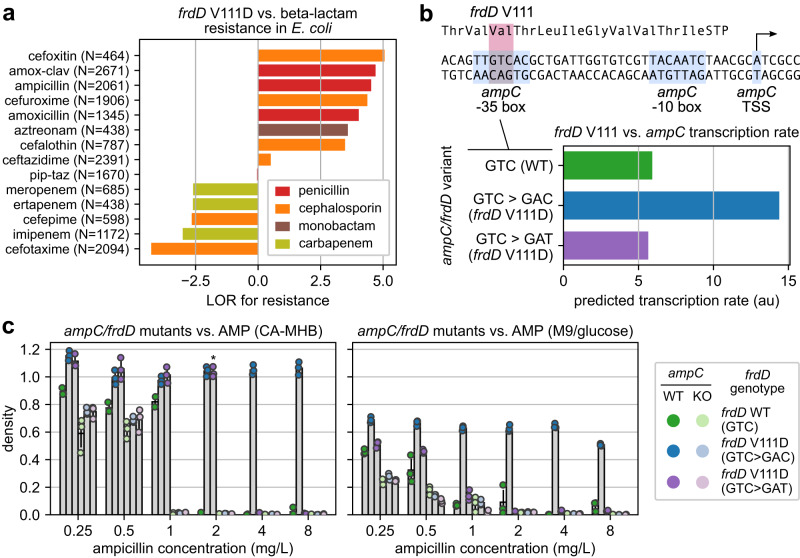 a Enrichment for resistant over susceptible genomes from the presence of frdD mutations resulting in the V111D substitution across 14 beta-lactam drugs, based on log2 odds ratio (LOR). Number of genomes with AMR data is shown for each drug. b Overlap between the frdD coding region and ampC promoter in E. coli BW25113 and predicted ampC transcription rates for various frdD mutations affecting V111. c Maximum cell density (OD600) achieved by ampC and frdD mutants under increasing ampicillin (AMP) concentrations in rich (CA-MHB) or minimal (M9) media. Error bars indicate standard deviations centered around means from biologically independent triplicates. Six genotypes were tested, from combinations between three possible codons in frdD affecting V111 in either the BW25113 wildtype (WT) or corresponding ampC knockout (KO) strain. Starred case indicates growth was not observed until at least 8 h after inoculation for all replicates.
